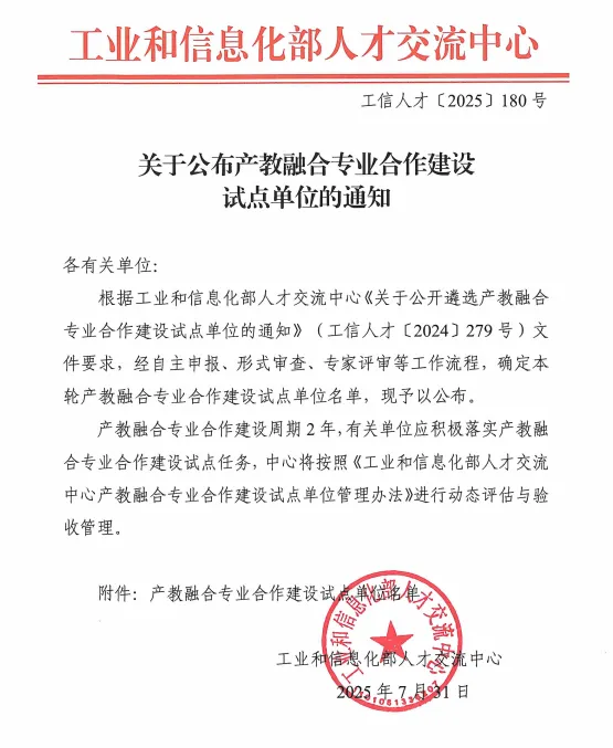 近日,工业和信息化部人才交流中心发布《关于公布产教融合专业合作建设试点单位的通知》。经自主申报、形式审查、专家评审等流程,科教城内两所高校——常州工程职业技术学院药品质量与安全、大数据技术专业,常州信息职业技术学院机电一体化技术专业成功入选。这一成果标志着两校在深化产教融合、提升人才培养质量方面迈出了重要一步,也为后续共建产教融合深度合作平台、构建产教融合发展新生态、促进专业高质量发展奠定了坚实基础。