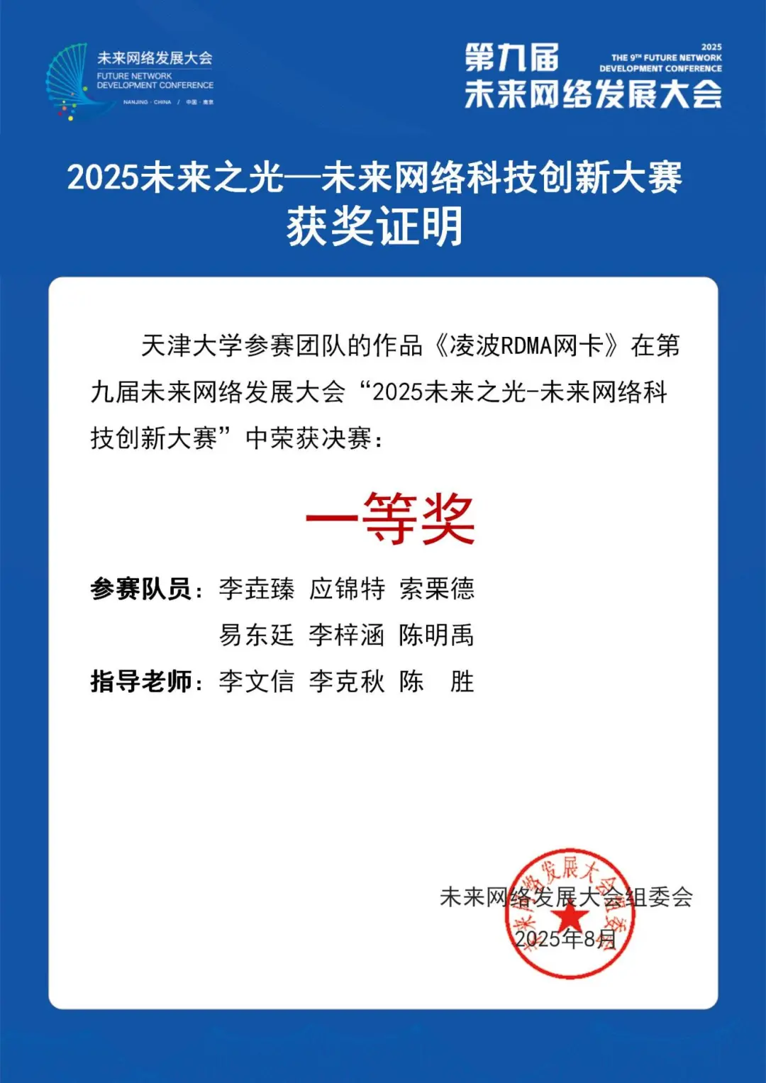 | 科教城“凌波RDMA网卡”项目荣获“2025未来之光-未来网络科技创新大赛”决赛一等奖! |