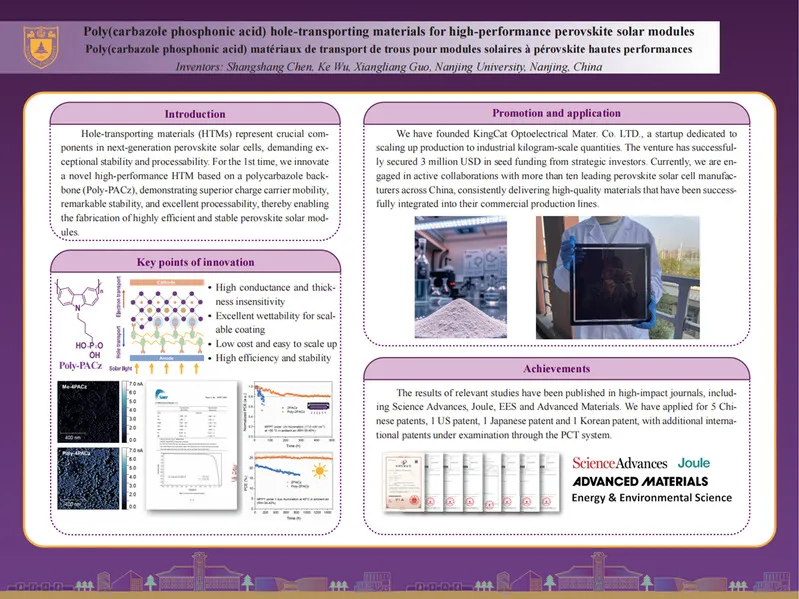 公司不大,却是“含着金钥匙出生的”。创始人是无锡尚德太阳能电力有限公司前董事长;技术来源于南京大学化学院团队,今年4月,该团队研究成果“基于聚磷酸咔唑的高性能钙钛矿光伏正极材料”获第50届日内瓦国际发明展银奖。