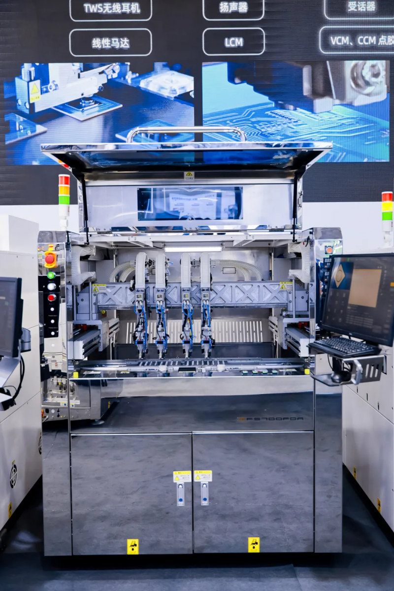 主机展示区,铭赛科技呈现了多款高精度点胶设备。FS200A在线式双工位视觉点胶机采用双工位独立点胶设计,显著提升作业效率,满足CCM/VCM模组等高精度点胶需求。