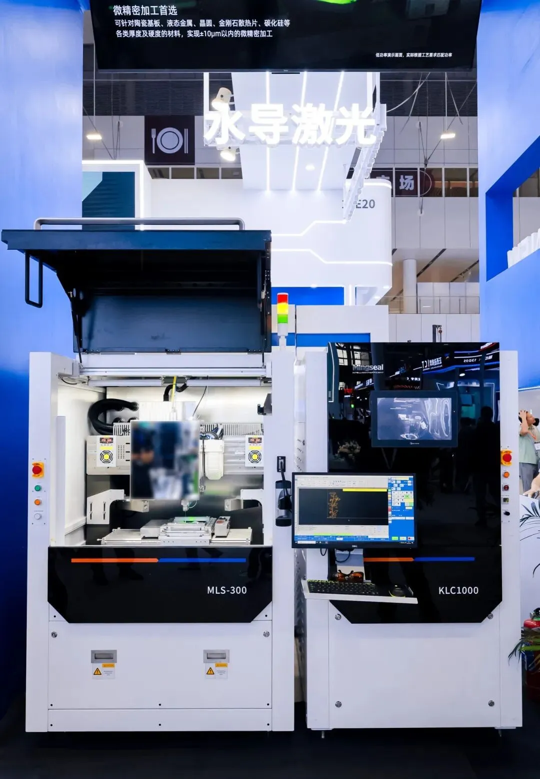 02水导激光:颠覆传统加工工艺革新 本次展台最大亮点——MLS300超精密级水导激光加工系统,是铭赛科技自主研发的重磅产品。这套系统可对陶瓷基板、晶圆、碳化硅等硬脆材料实现超精密加工,精度控制在±10μm以内。