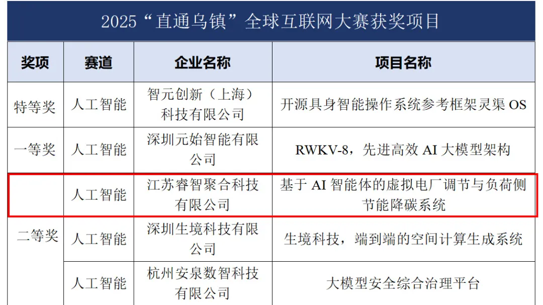 11月9日,2025“直通乌镇”全球互联网大赛总决赛在浙江乌镇圆满落幕。科教城企业江苏睿智聚合科技有限公司凭借其自主研发的“基于AI的虚拟电厂调节与负荷侧节能降碳系统”项目,在全球29个国家和地区的1082个参赛项目中脱颖而出,荣获大赛二等奖,并在竞争激烈的人工智能赛道中位列第三名(特等奖1名、一等奖1名、二等奖3名,睿智聚合为二等奖首位),展现了科教城在人工智能与能源数字化领域的硬核实力与创新引领。