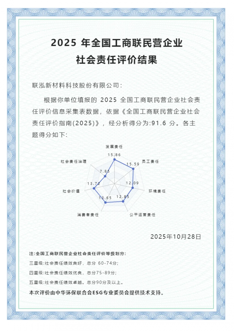 近日,全国工商联组织开展2025年度民营企业社会责任评价,依据企业在发展责任、员工责任、环境责任、公平运营责任、消费者责任、社会价值与社会责任治理等维度的综合表现,评定企业社会责任等级。联泓新科以91.6分的成绩获得最高评价等级“五星级”。