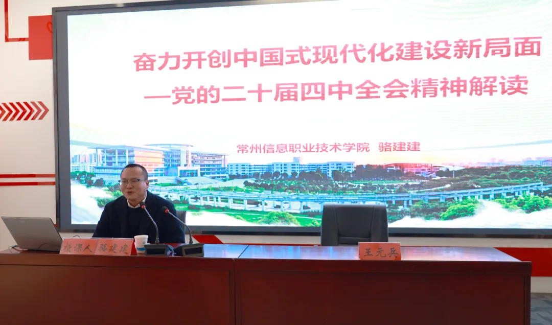 11月27日下午,科教城举行党的二十届四中全会精神专题报告会。会议特邀党的二十届四中全会市委宣讲团成员、常州信息职业技术学院党委委员、宣传部长骆建建教授作题为《奋力开创常州市现代化建设新局面——党的二十届四中全会精神解读》的专题报告。
