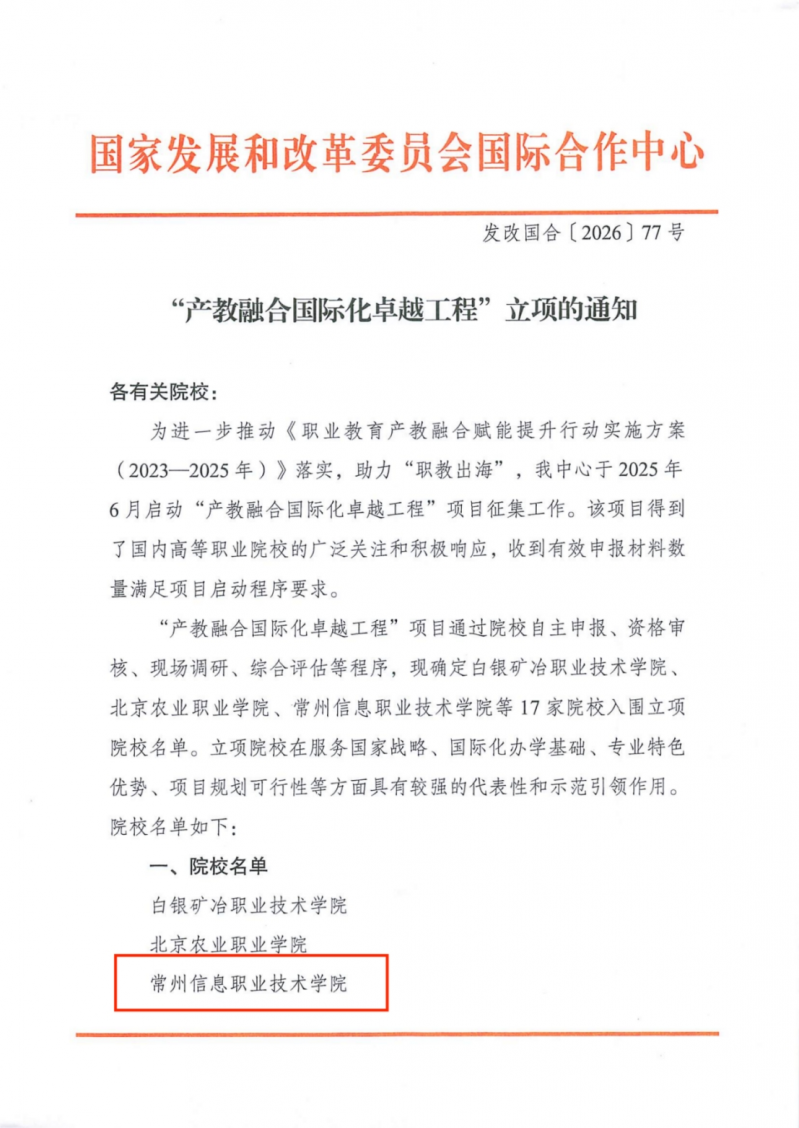 近日,国家发展和改革委员会国际合作中心正式发布“产教融合国际化卓越工程”立项通知,经院校自主申报、资格审核、现场调研、综合评估等多环节严格遴选,常州信息职业技术学院成功入选立项院校名单。